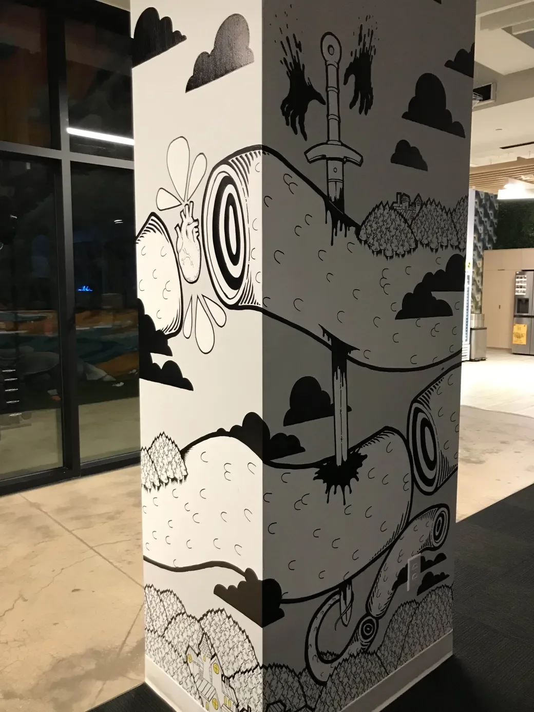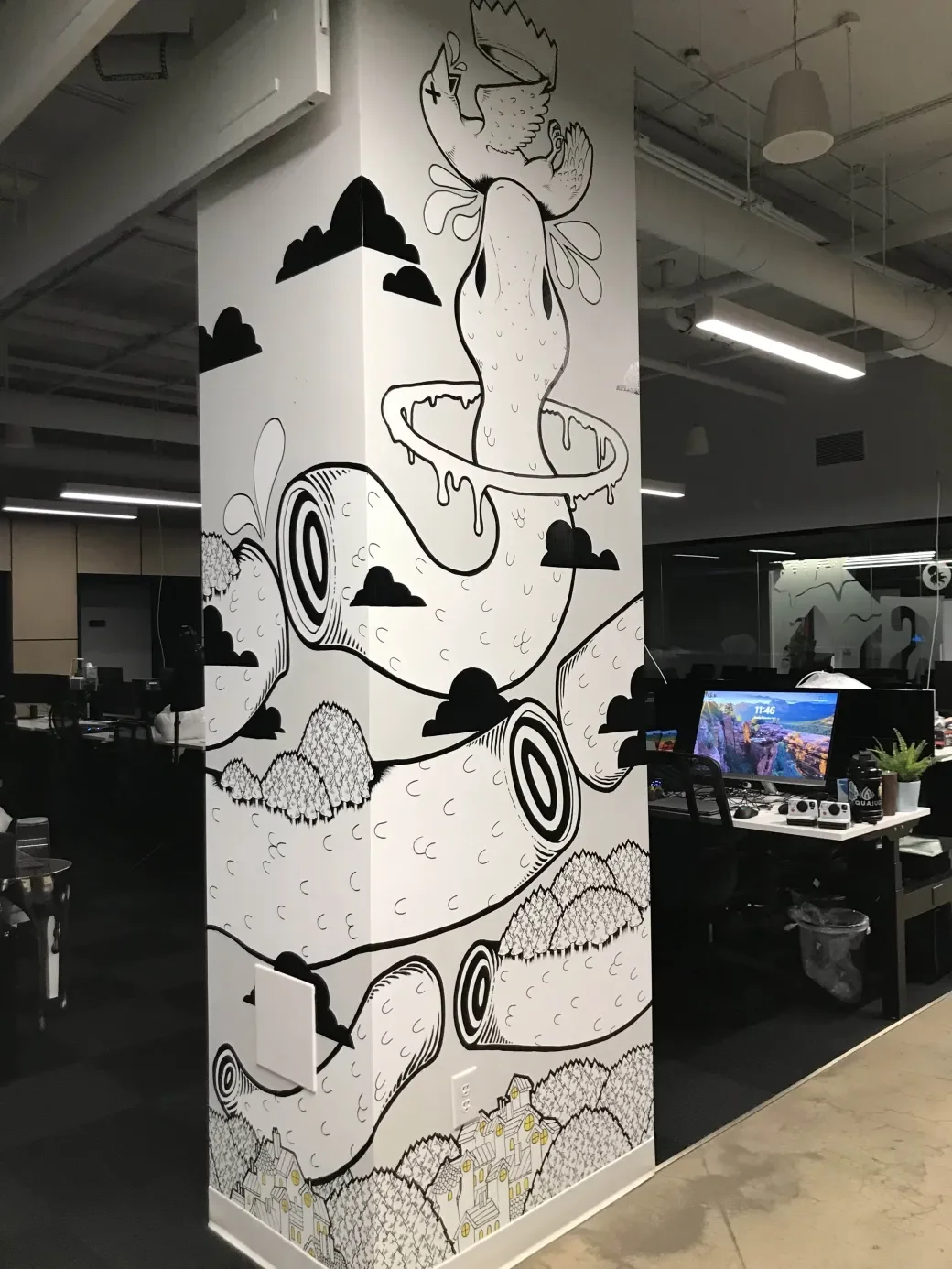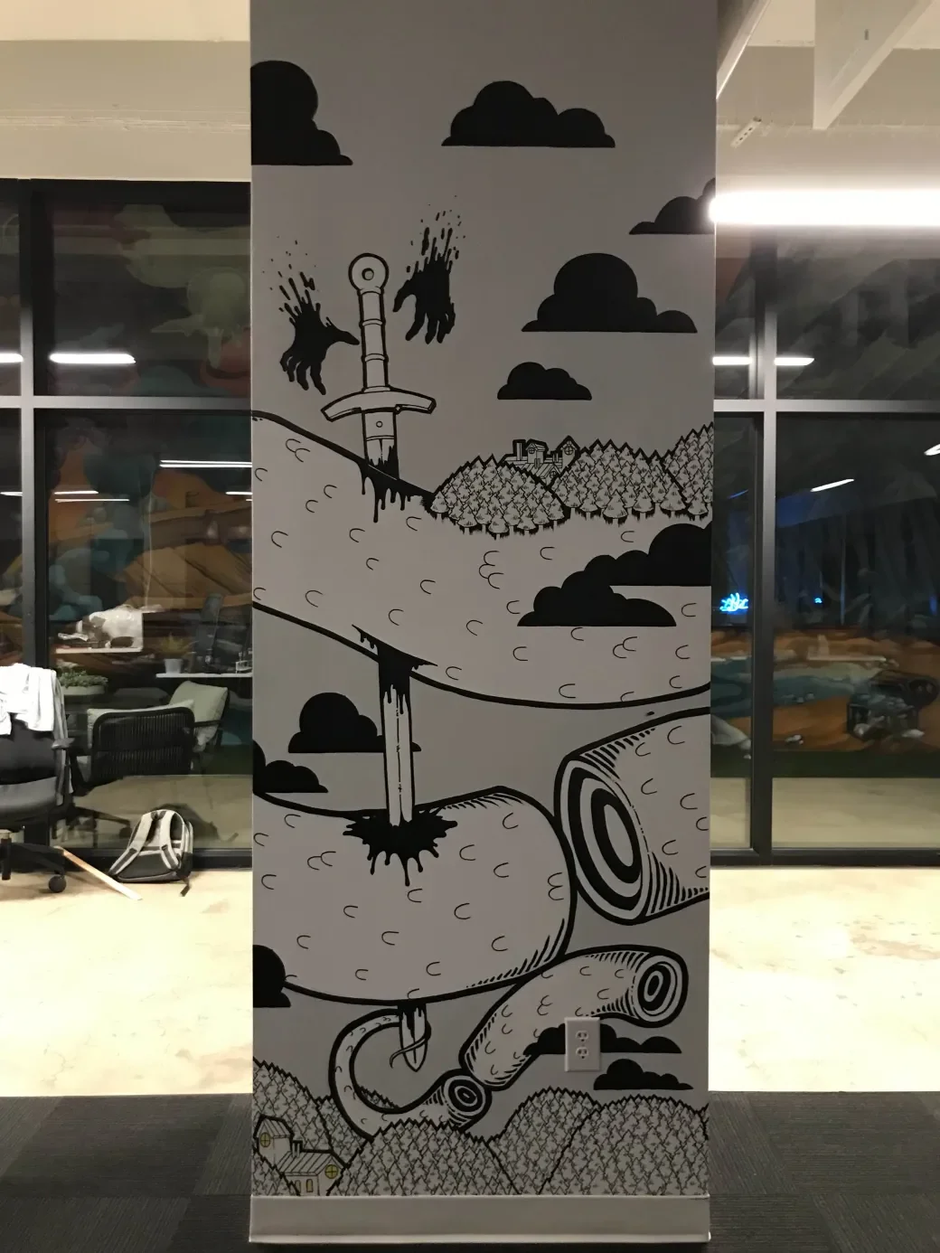 This is a mural I hand-painted in the INK Games studio. There’s a bunch of great art in the studio, but somehow this pillar had gone untouched, and was just waiting for some paint. When my boss (who has always been a big supporter of my art) asked me if I wanted to throw some art on the walls, I knew exactly where I wanted to start!