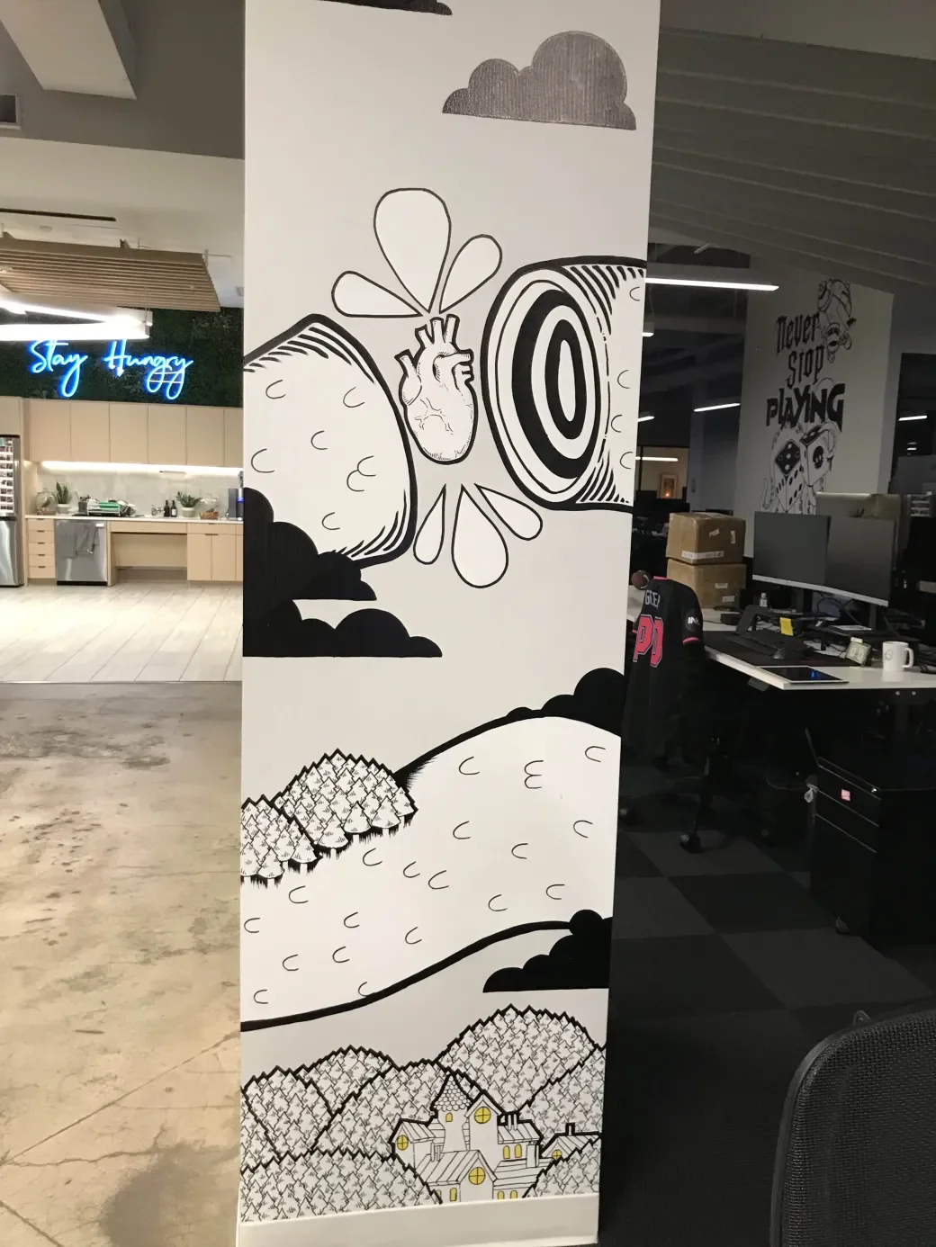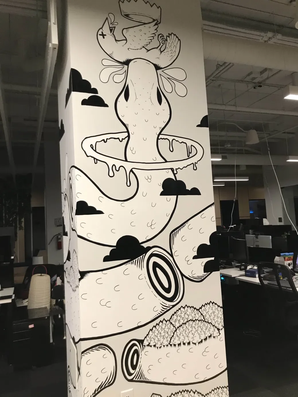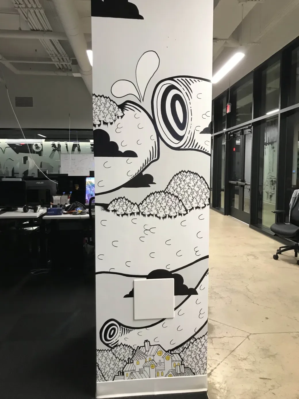 This is a mural I hand-painted in the INK Games studio. There’s a bunch of great art in the studio, but somehow this pillar had gone untouched, and was just waiting for some paint. When my boss (who has always been a big supporter of my art) asked me if I wanted to throw some art on the walls, I knew exactly where I wanted to start!